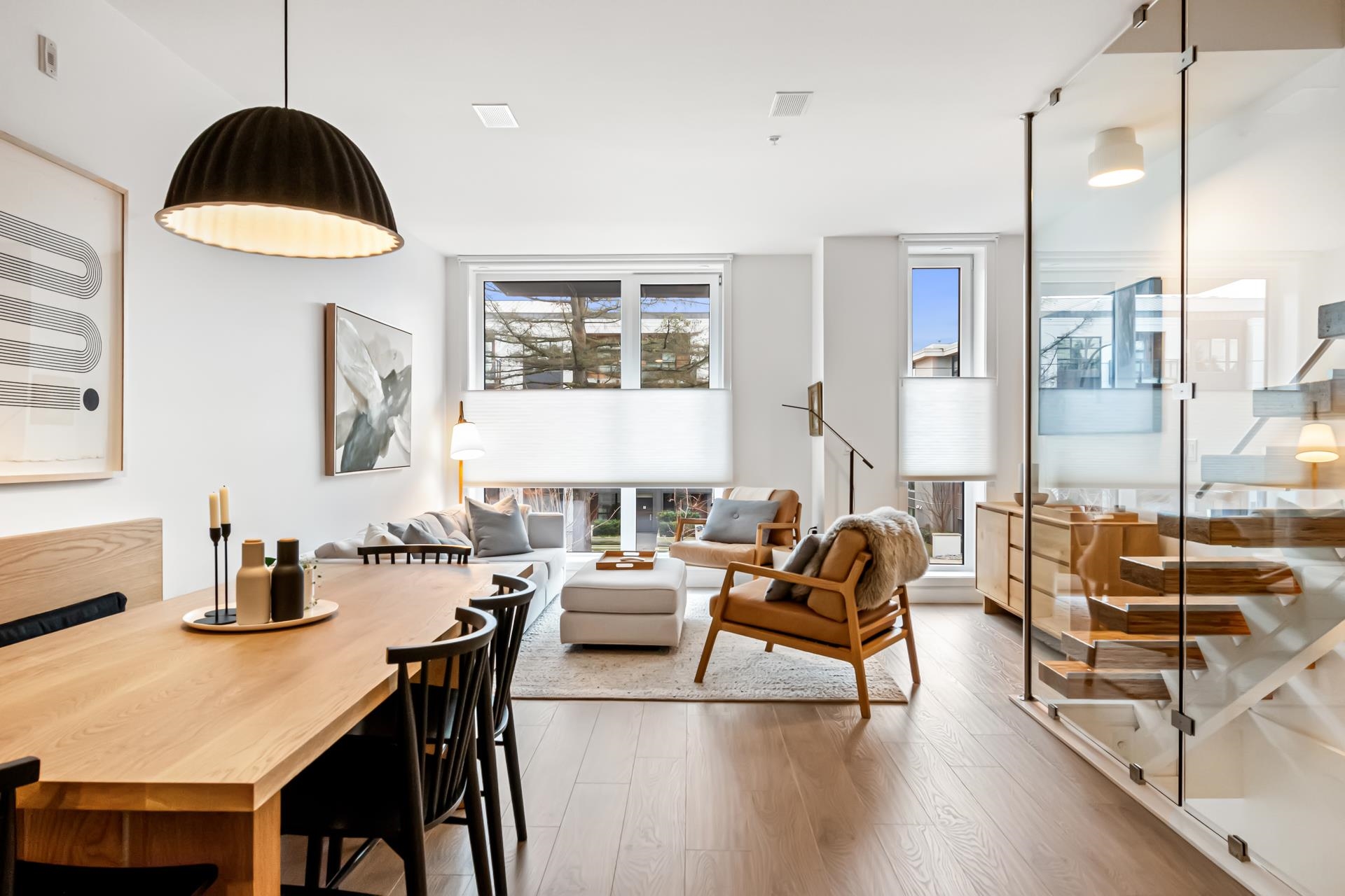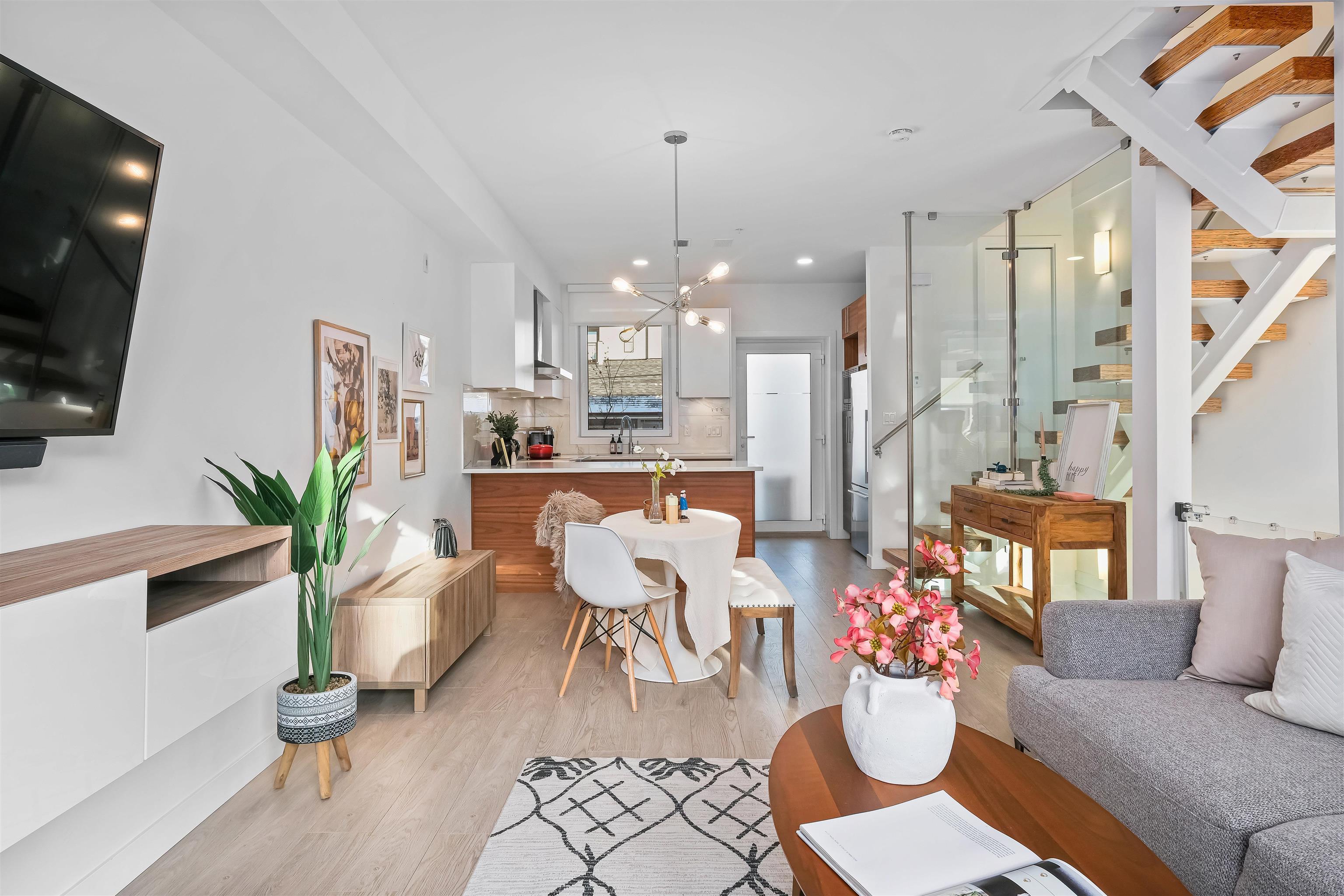 Southwest exposed end-unit townhome with 3 parking, including a 630 square ft 2-car garage + storage/workshop in the LEED-certified Green on Queensbury. This 2-level, 1,414 square ft home offers a bright, open layout with a modern kitchen featuring integrated appliances, gas cooktop, and quartz counters with island seating. The main includes a formal dining (convertible to 3rd bed) & flows to a 360 square ft patio facing the park with gas, water & electricity- perfect for entertaining! An den/flex, 3-pc bath, & mud rm with storage complete the main. Upstairs offers 2 beds & 2 full baths, in suite laundry, lots of storage & a spacious primary with walk-in closet, 5-piece ensuite, & covered balcony for year round enjoyment. The cherry on top is a gated 32 ft long dbl garage (+ 3rd parking stall) with a unique attached workshop offering incredible utility for bikes, tools, or hobbies - a standout seldom found in townhomes. Located on Moodyville Park, you are steps to transit, Spirit Trail, and Shipyards/Quay for everything you need! (id:23770)